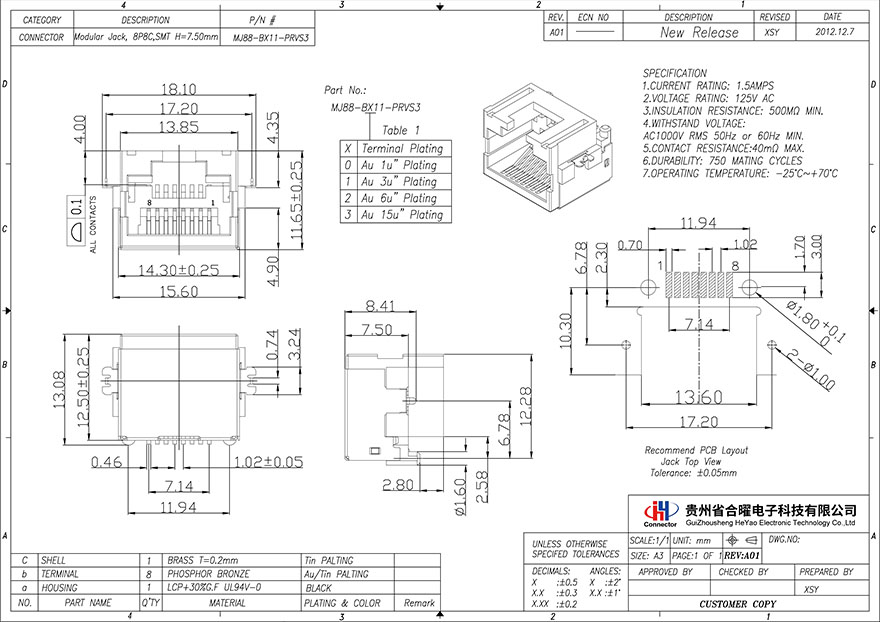 MJ88-BX11-PRVS3 RJ45沉板SMT H=7.50