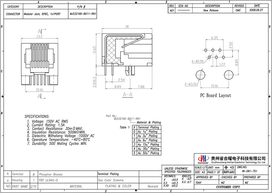 MJ532166-BX11-RN1 6P6C 1X1 全塑